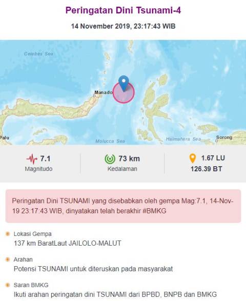 Peringatan tsunami dikeluarkan BMKG pada pukul 22.08 WIB atau 00.08 WIT. Sejumlah wilayah di Maluku Utara seperti Ternate hingga Halmahera dan Bitung Sulawesi Utara dilanda tsunami setinggi o,5 m.